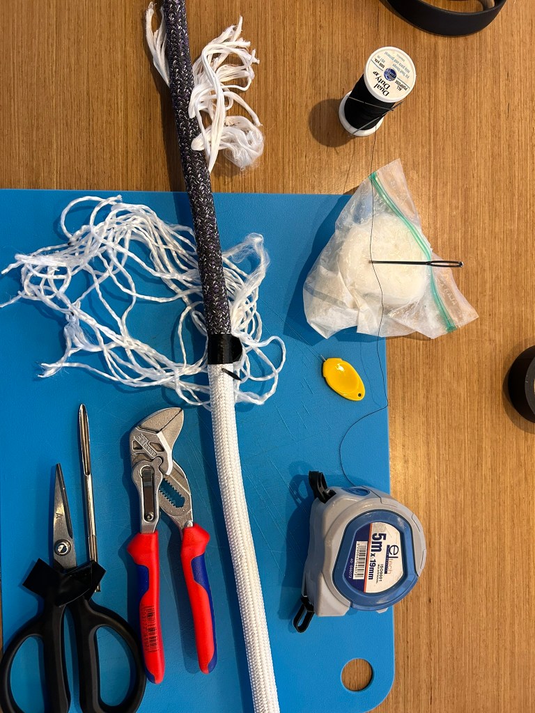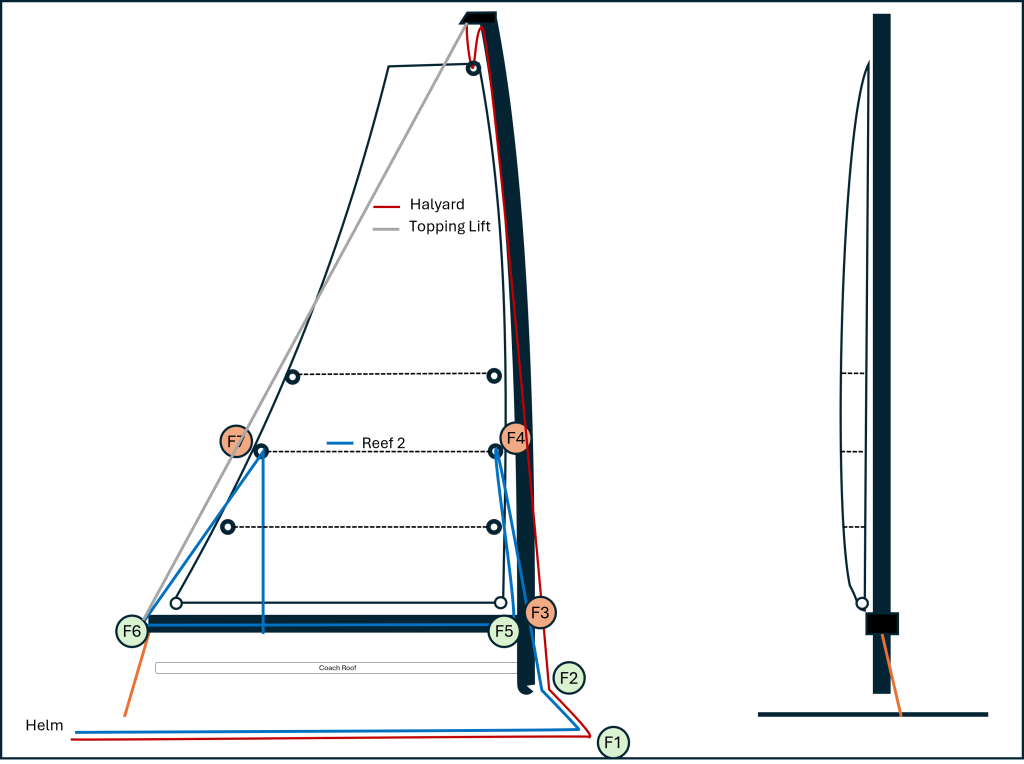 Even with this procedure, the high friction points (F3, F4, F7) are a problem to manage. By covering these points with Dyneema chaffing covers, including the entry into the mast end of the boom, you’ll avoid that dreaded popping sound, which you know wasn’t a wave just hitting the hull.