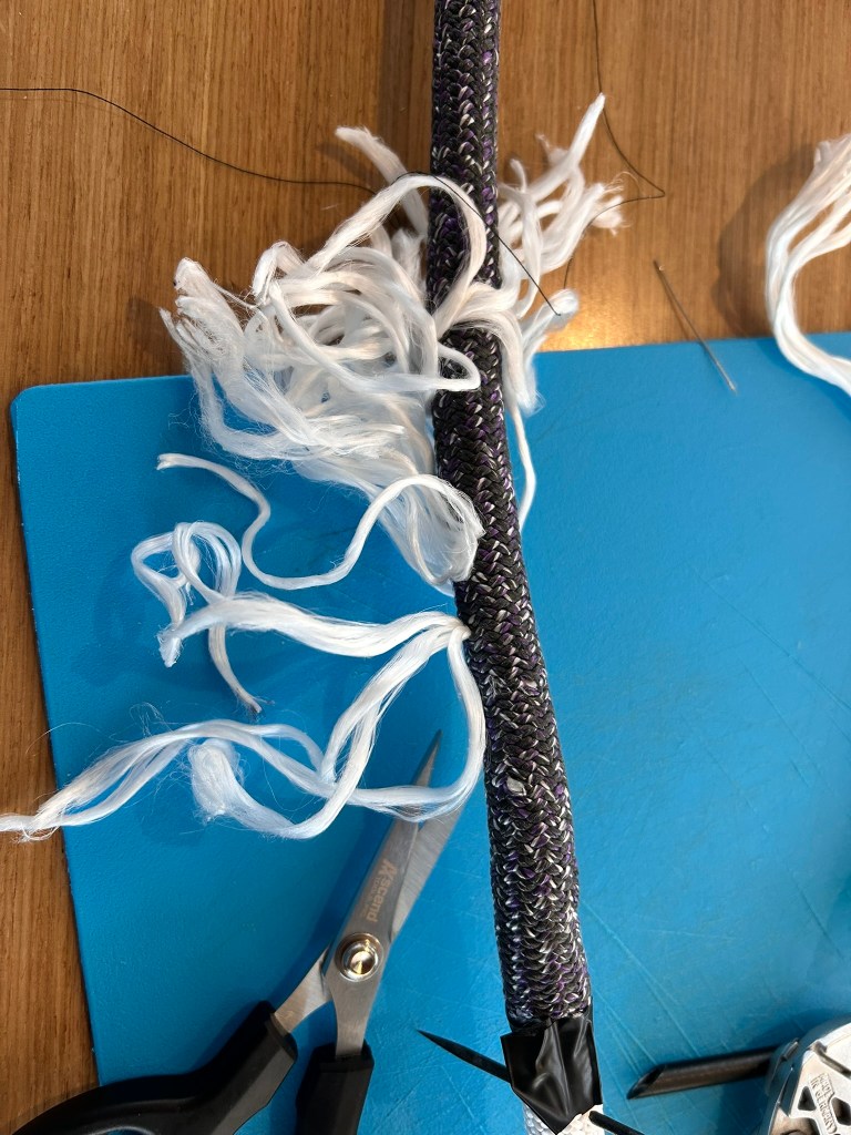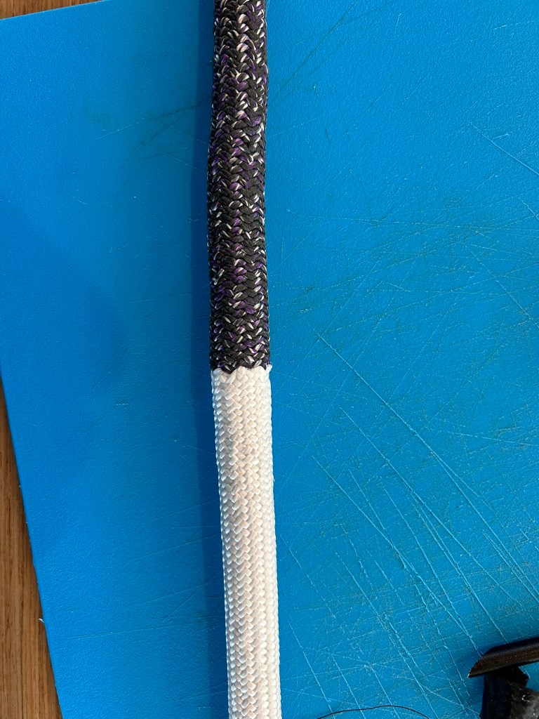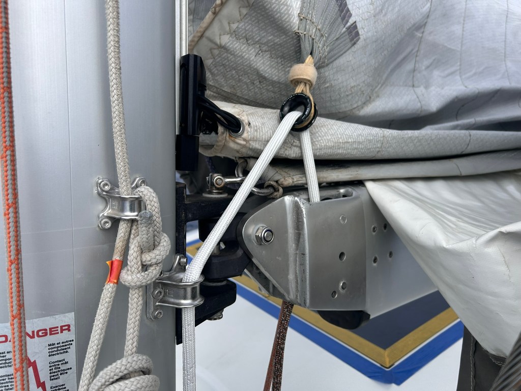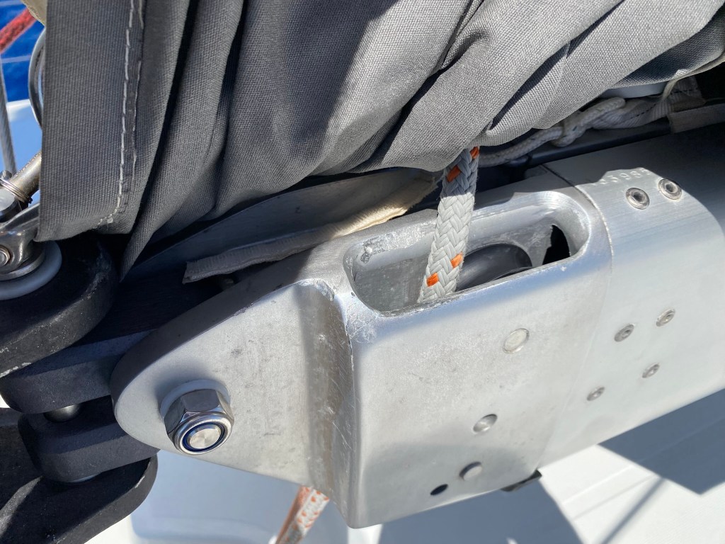 The light green points (F1, F2, F5, F6) use sheaves on the deck organizers and blocks at the base of the mast and within the boom. The guide on the mast (F3) creates an additional friction point as the angle increases when the new foot is established. The orange tack and clew points (F4, F7) use friction rings that allow the lines to flow through them with minimal space. However, these do create more friction than rotating blocks and organizers. The other big friction point is the entrance into the front of the boom, as it can easily chafe the line on the boom, causing the cover and core to blow, resulting in the boom scraping the coach roof. The last friction point is the mast guide (F3). We’ll discuss using chaffing covers later.