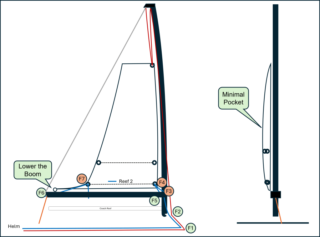 To finish the set, use the Archimedes method to trim the mainsheet with the boom as the lever. Remember, pressure builds from the starting point of motion. The leverage of the boom will pull the new clew tighter, as the starting point of motion has been reversed from the tack to the clew. This balances the pressure of the new tack. The tack will go slightly higher, giving some space for the reef line to enter the boom more cleanly (F5), and increase the angle on the mast guide (F3), and the clew will tighten in, giving space for the main sheet to be trimmed without risk of damage to the roof.