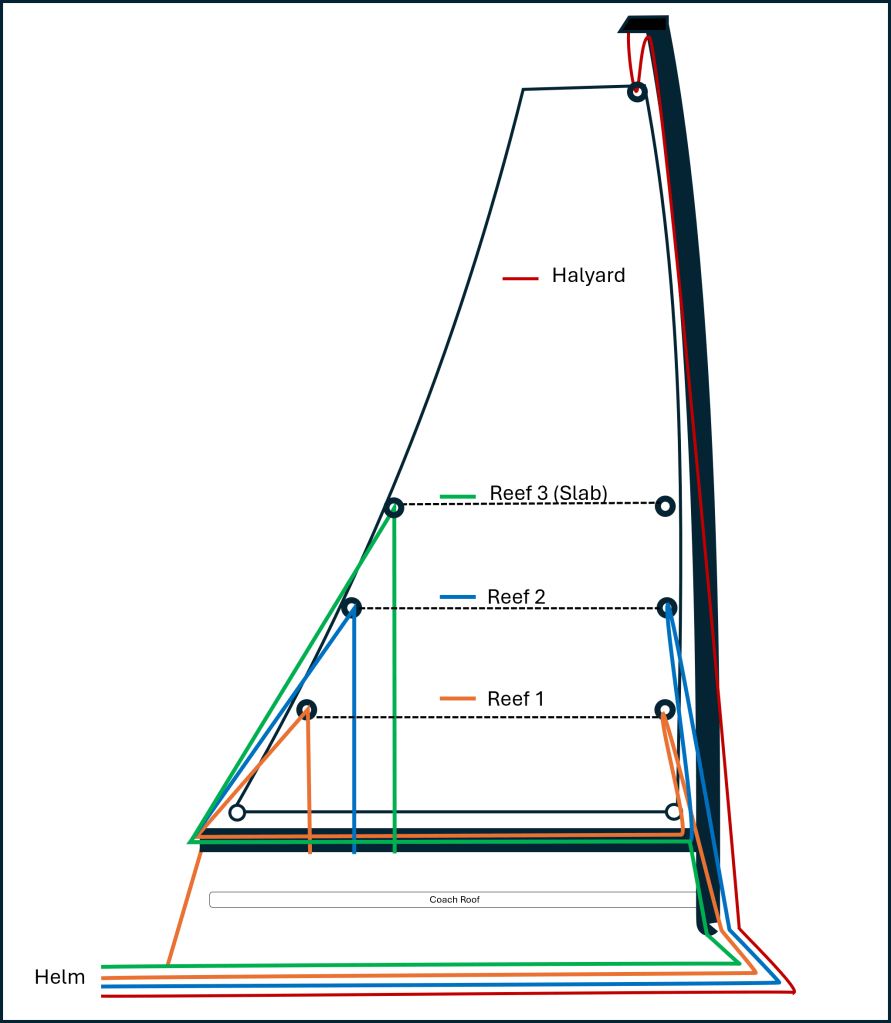 As the halyard lowers, pull in the reef line, focusing on the clew. Noting the reef line is 1:1, and the halyard is 2:1, the reef will need to be pulled in twice as fast. Don’t stop when the tack is set, and don’t attempt to set the new clew in its eventual place, as it will require more strain on the tack line. With the raised boom, pull the clew close until the winch sounds “it’s done”. In stronger winds, if the winch is complaining before you’re happy with the set, pull reef 3 into a closed clutch, helping flatten the sail. Since reef 3 is a slab system, it can be pulled by hand. Then finish pulling in the reef line with the winch.