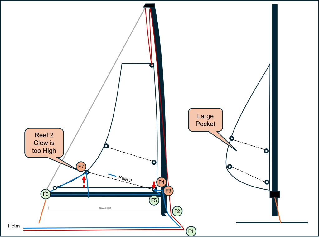 The common complaint with single-line reefing is the friction it creates. Focusing on Reef 2, there are several friction points, indicated in different colors. Below are views of the sail from the starboard and the stern.