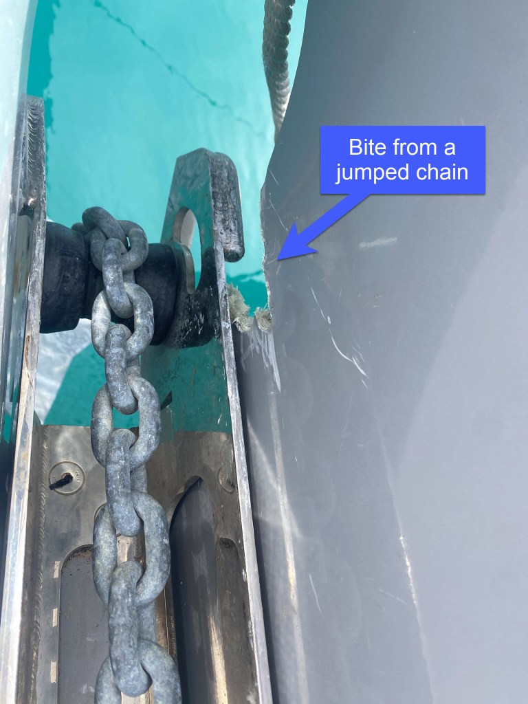 Our Excess 14 had damage to the longeron, from a bow roller without a chainguard. While anchoring, before getting the bridal on, it’s not that difficult to have the chain jump out under windy conditions. Excess repaired the longeron and replaced the bow roller with a version with a chain guard.