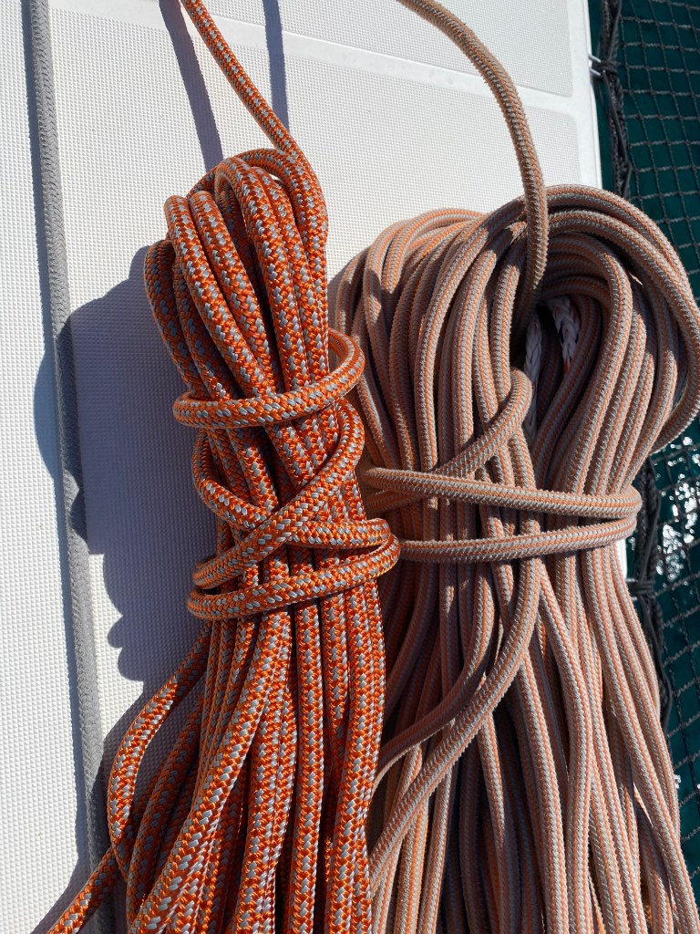Here’s an image of lines that have been on the boat, and a line that was stored below, and not yet used. The code- Halyard on the right was recently washed.