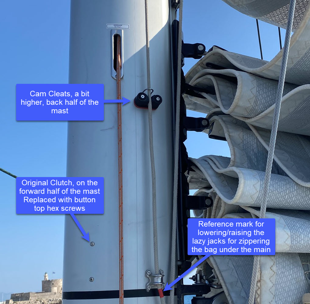 If you have one of the original hulls, your topping lift clutches may be on the forward half of the mast. It doesn’t take much to have a jib sheet catch the clutch lever and feed it to the kraken. Newer hulls have the clutch on the back half of the mast. We opted to use Harken Cam Cleats.