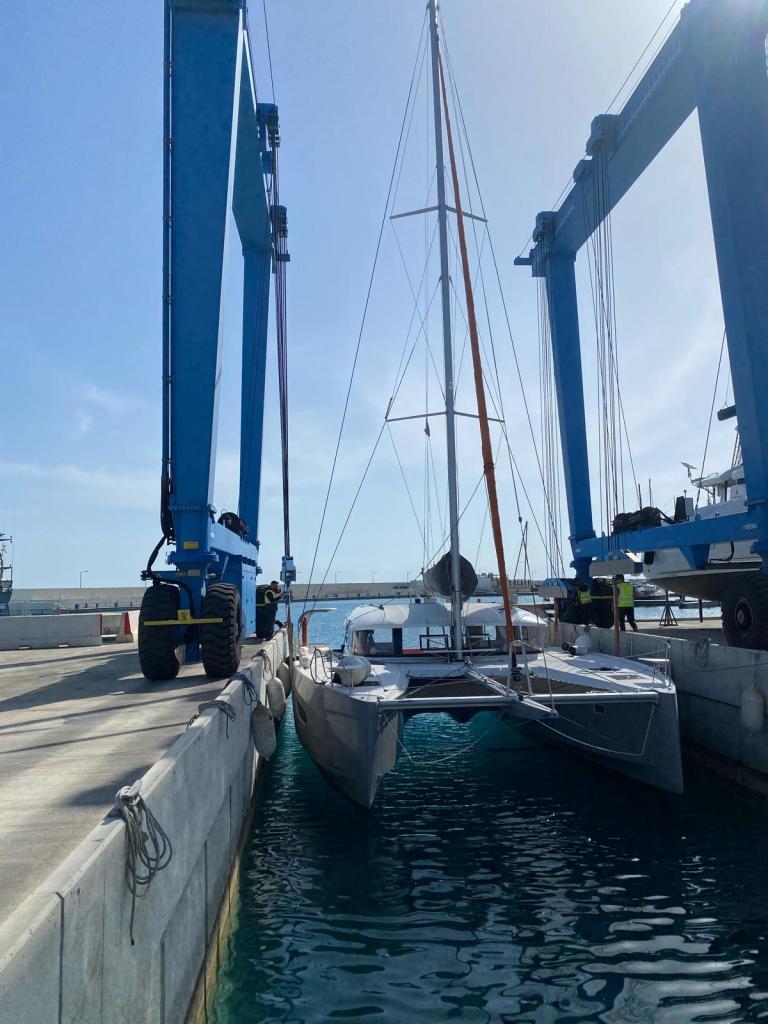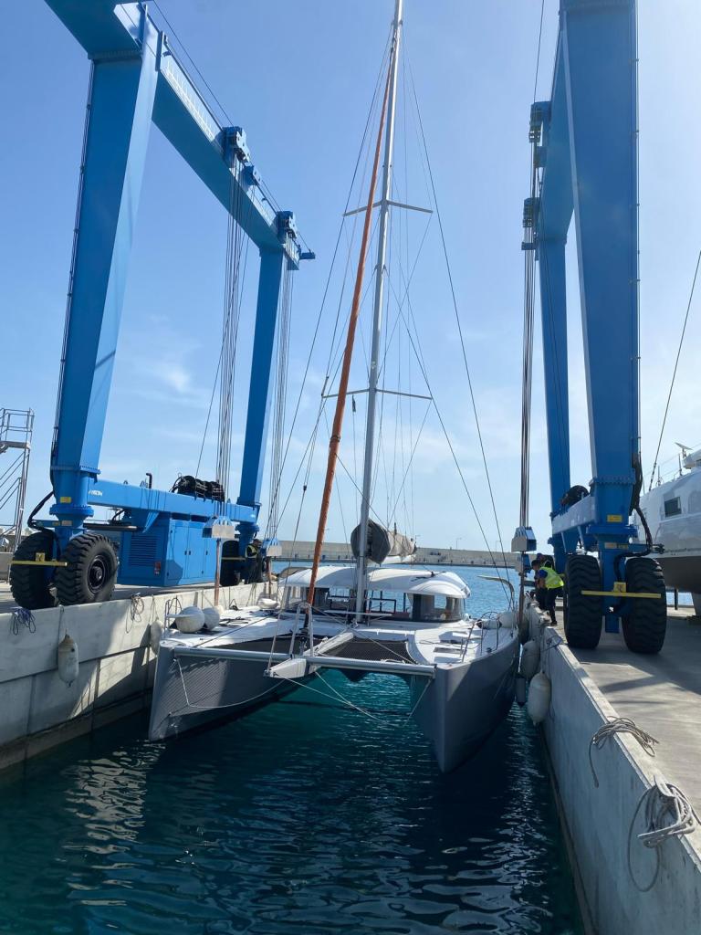 When looking to get hauled out, don’t underestimate how wide she is. You’ll need at least 8m, and that’s just barely enough to squeeze in flat padding alongside the hulls. You may have a problem fitting into a lift, as many aren’t wide enough.