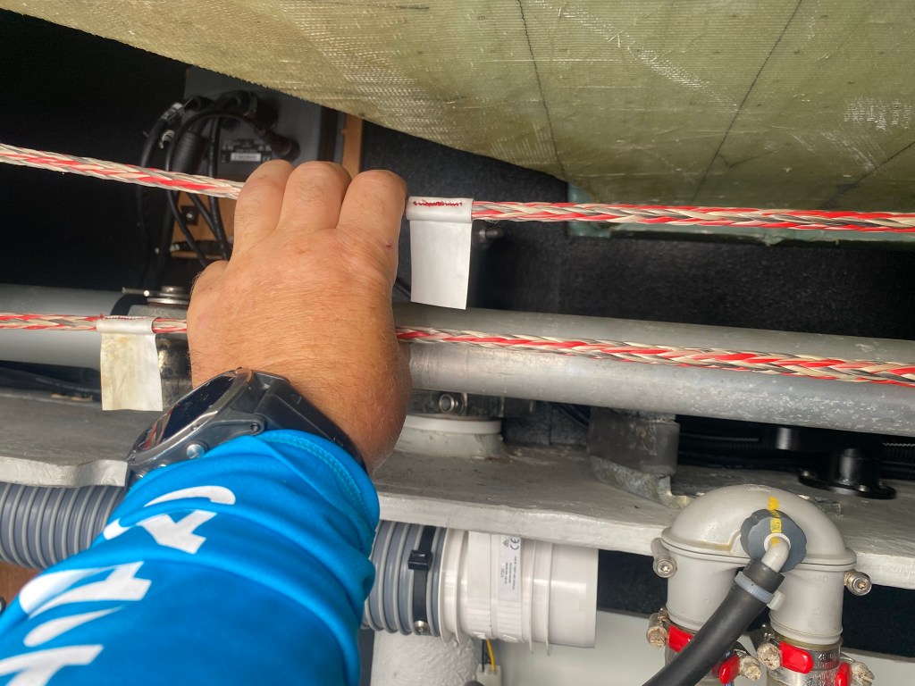 Tensioning is done through the Port engine. Other Excess owners have said recommended tension was 45 kg (+/- 5 kg). However, without a tensioner, or a home port, it’s hard to measure. After two months of constant sailing, I’ve noticed ours has become more slack. I used a deflection method to test the tension, and adjusted to limit the deflection, while still maintaining a solid feel in the wheel.