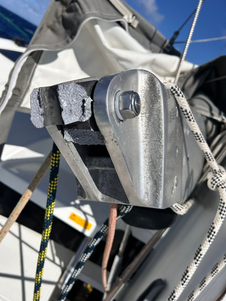 On a crossing in 2025, we had the unfortunate loss of the gooseneck. (See here Archimedes Single Line Reefing) The stock gooseneck toggle is cast aluminum, making it quite brittle. The newer replacements are milled aluminum, which is much stronger. I’ve ordered a replacement and will be swapping ours out as a preventive measure.