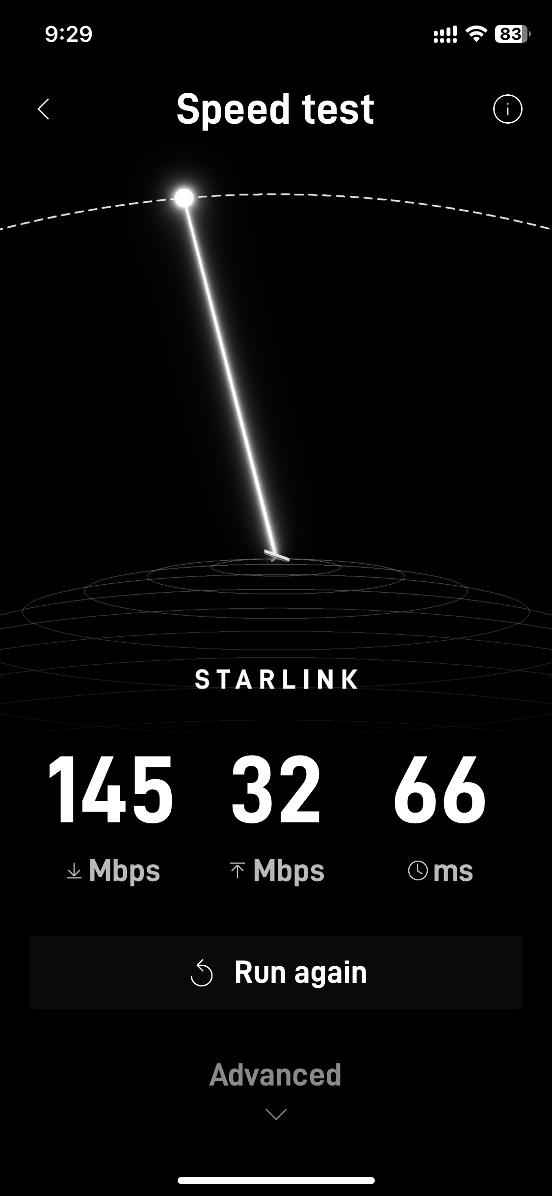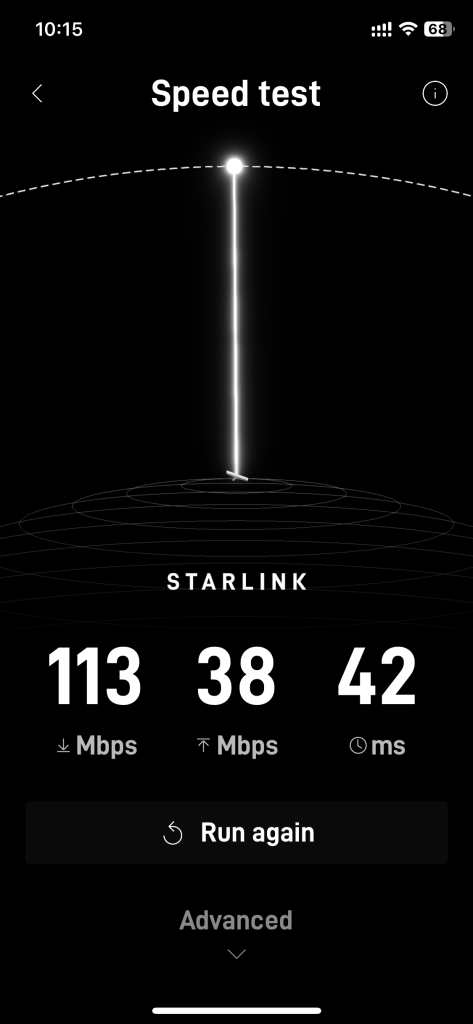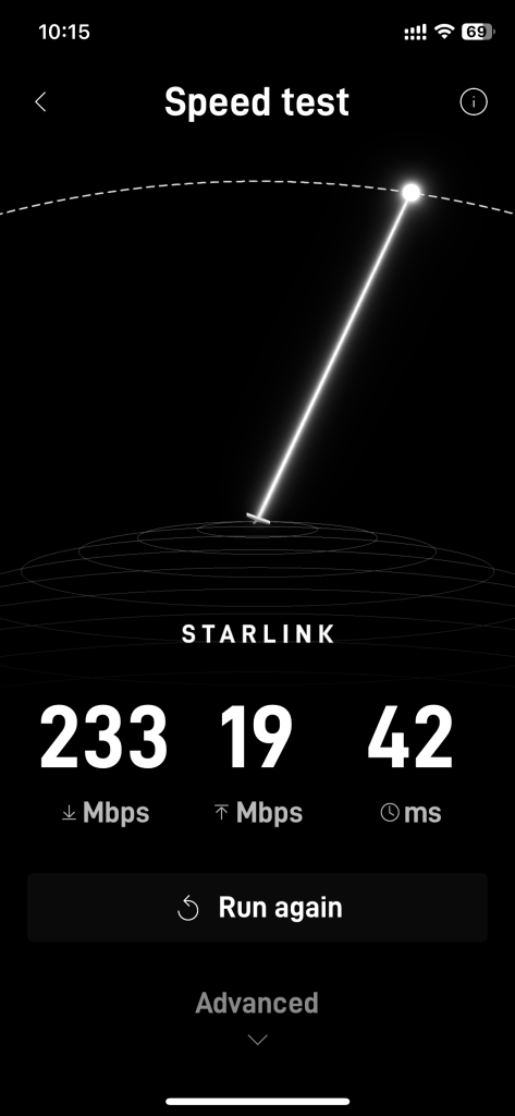 What performance do we get without the hatch? The Starlink App has two modes. “Internet”, meaning the satellites to the Router and iPhone to Internet, which adds the Wi-Fi to the mix. Since it’s impossible to achieve higher bandwidth on Wi-Fi than what’s available, the 299 reflects the large variance between different satellites as they wiz by.