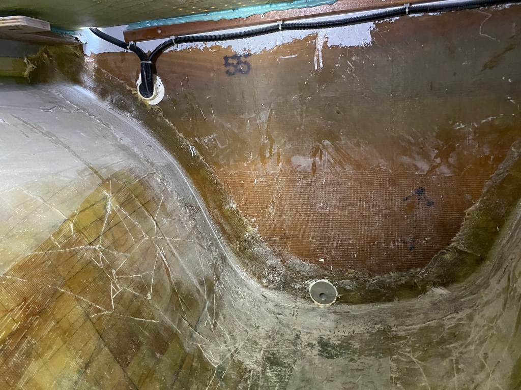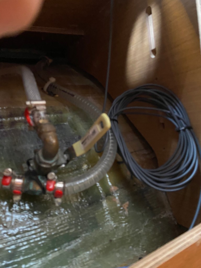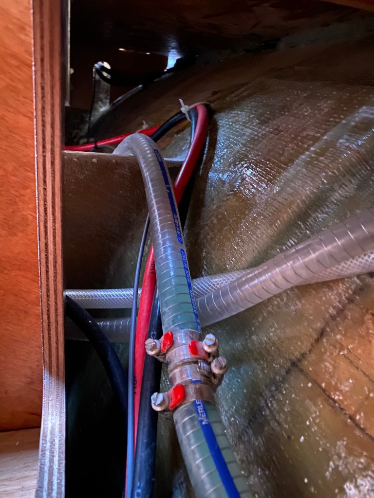 There’s lots of options for where to connect, including temporarily plugging into AC (230v/120v) in the port-bow cabin. Or, running the 12v wire into the power panel. We’re doing some solar/battery/inverter upgrades that will require rewiring the panel, and I don’t currently have a spare 12v breaker, so I’m deferring the 12v connections until the solar project. The blue taped areas are the temp routing, while the wiring under the bead is cable tied in place.