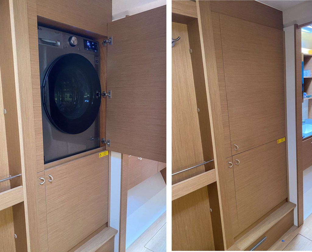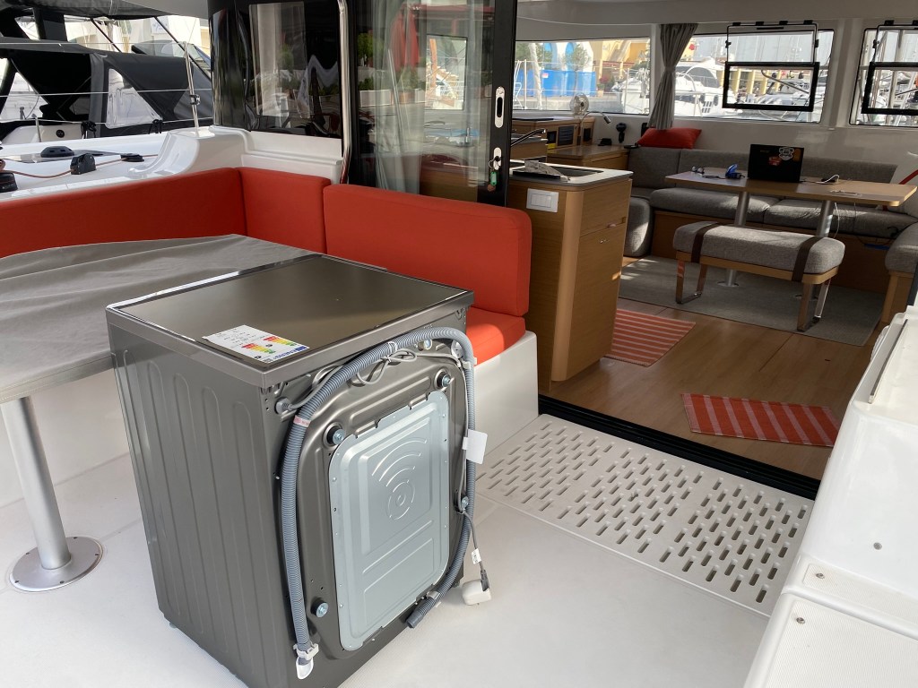 One of the many nice things about the owner’s layout of the Excess 14 is it provides for a full-sized (euro) combo washer/dryer. While Excess provided the ability to have the washing machine aboard, getting it installed was a bit of a puzzle.