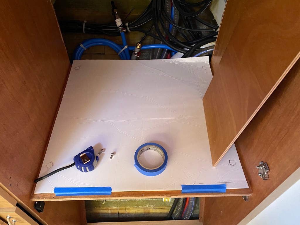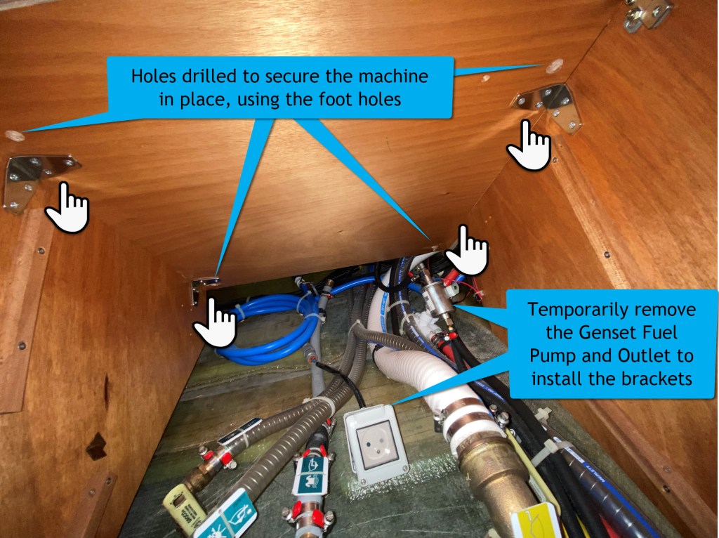 The last thing we want is a heavy thing falling 90cm into the hull. To assure it stays in place, I’ve removed the four leveling feet, and created a template to drill slightly larger holes for installation. The larger holes gave some wiggle room. Be sure to leave enough setback to clear the machine door, which is also about what you’ll need to clear the hinges.