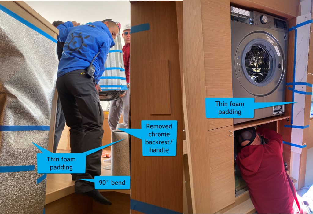 Once it’s in the hull, put everything back on, except the washing door, as that can be done later, and it’s just less to deal with.