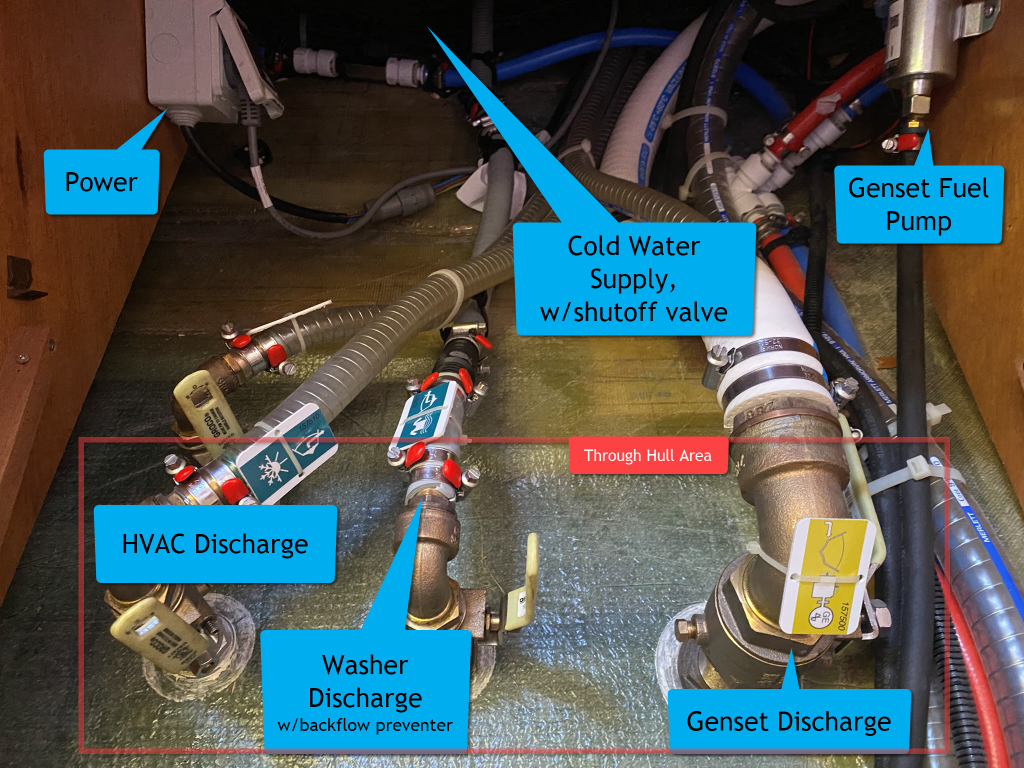 We were pre-plumbed for HVAC, Washing Machine and a Genset. If you don’t have the pre-install, note the area designated for the Through Hulls. This area is solid fiberglass. There’s no balsa core that gets exposed when you drill holes in your floating home. While there are techniques to drill through a balsa core, Beneteau/Excess have provided all the places you’ll need around the boat.